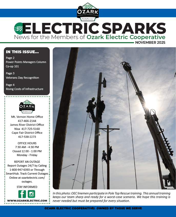 Ozark Electric distributes a monthly newsletter, Electric Sparks, found inside Rural Missouri magazine, to keep all members in our service area up to date with their electric cooperative. This publication provides an excellent means for communication between the Cooperative and our members!