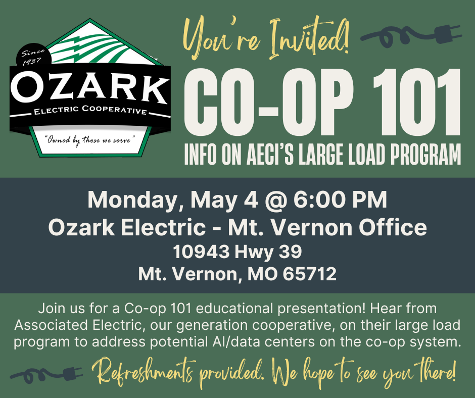Join us in Mt. Vernon on Monday, May 4 at 6:00 p.m. for our next Co-op 101 educational program! Hear from Associated Electric, our generation cooperative, on their Large Load Program put in place to address the potential for data centers on the cooperative system. If you've had questions about AI and the possibility of data centers, this would be a great program to attend.