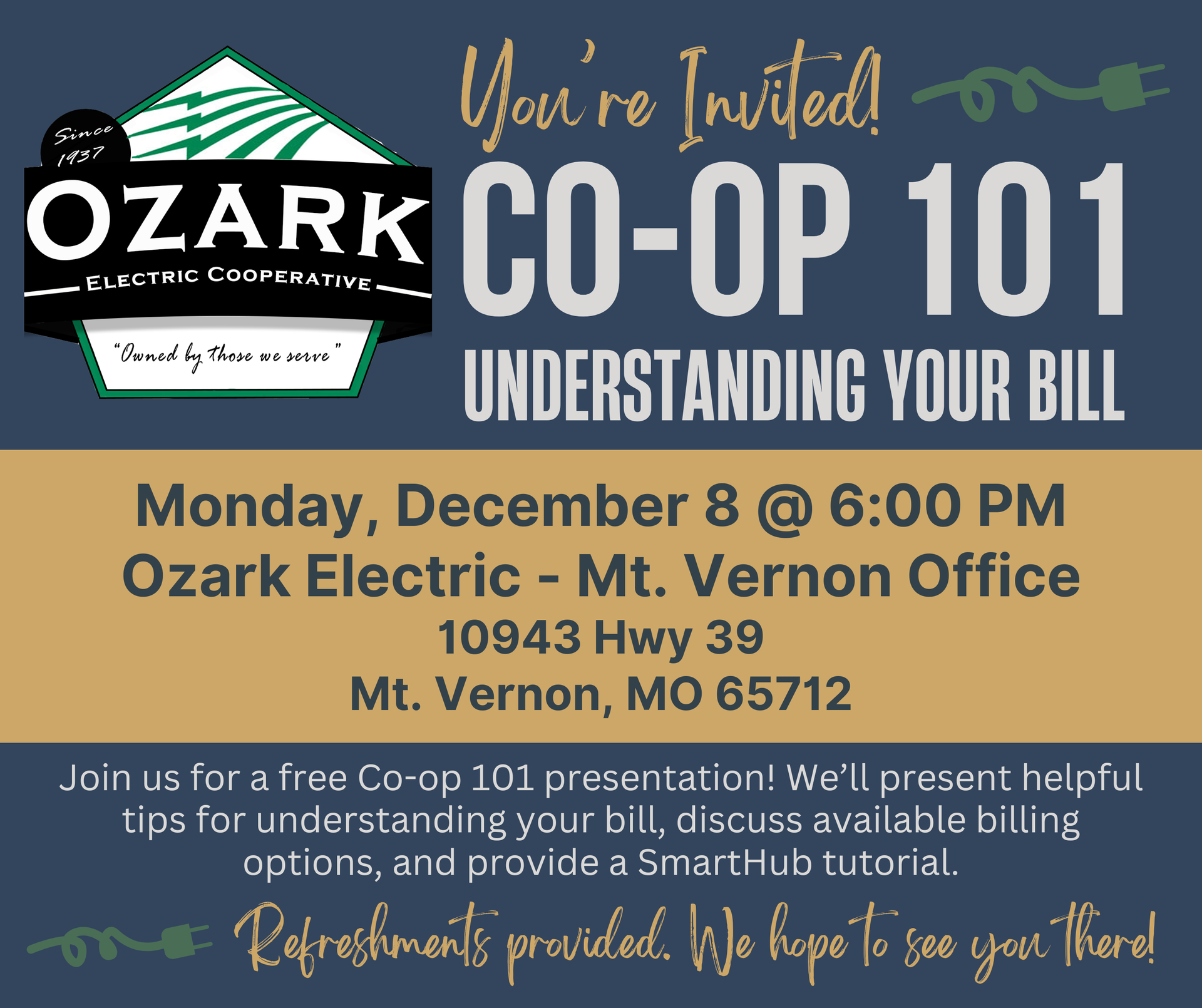 Save-the-date for our next Co-op 101! Join us at our Mt. Vernon office on Monday, December 8 at 6:00 p.m. for an educational program all about understanding your bill. Our Billing Services Manager will review items listed on your bill and discuss our available billing options. In addition, we'll provide a tutorial of the SmartHub program and information on rebates and upcoming community programs.