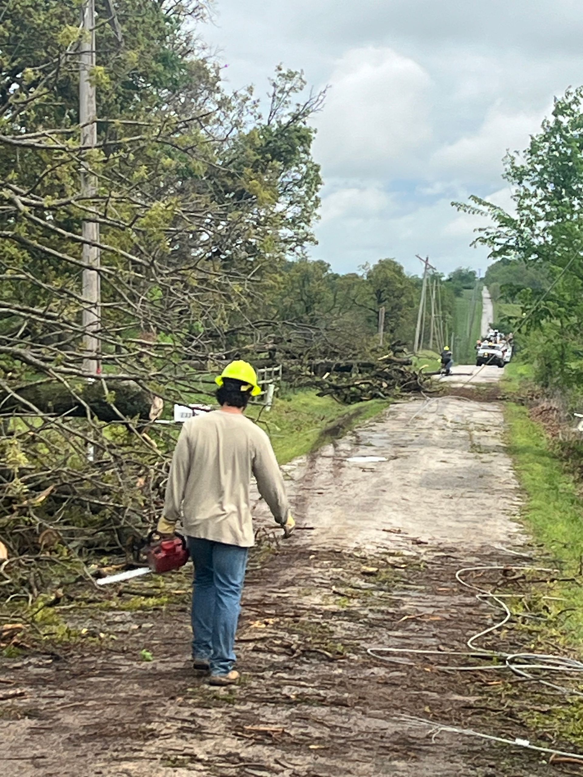 At our peak, nearly 10,000 members were out of power - the highest number of outages since the 2007 ice storm. Our team responded immediately to assess damage, contact tree contractors to begin clearing debris and rebuilding, and develop a strategy for restoration. Six crews (12 linemen) from White River Valley Electric Cooperative (Branson) arrived on Tuesday, and three crews (six linemen) from Laclede Electric Cooperative (Lebanon) arrived on Wednesday to assist our team in the restoration efforts.