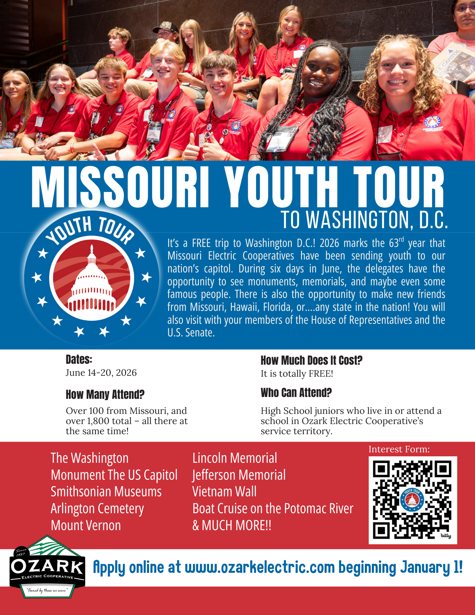 Youth Tour winners may be asked to promote the contest to local organizations and attend Ozark Electric's Annual Meeting (July 31, 2026) as a Youth Tour representative. One Missouri delegate will also be selected to serve on the national Youth Leadership Council as a representative of all Missouri co-ops.